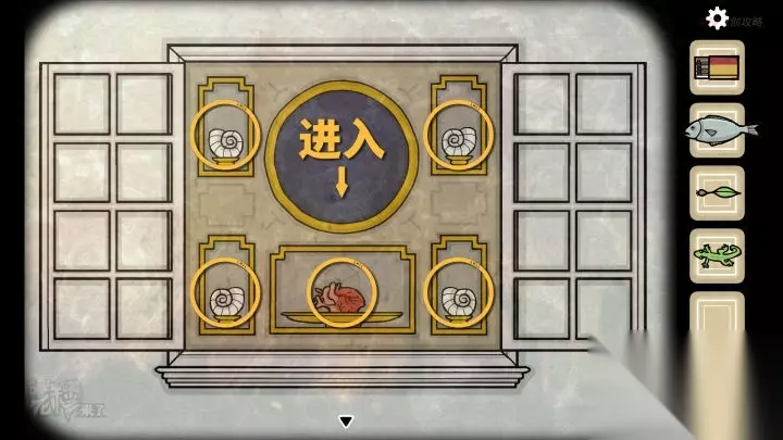 虫子-落地钟视角:进入到【叔祖父】嘴部的最深处,可以看到图形磨盘,按照微博的更新时间顺序得到符号的顺序:I-【△】,II-【日】,III-【螺旋圈】,IV-【S】,这是右侧的机关打开,可以拾取【虾】