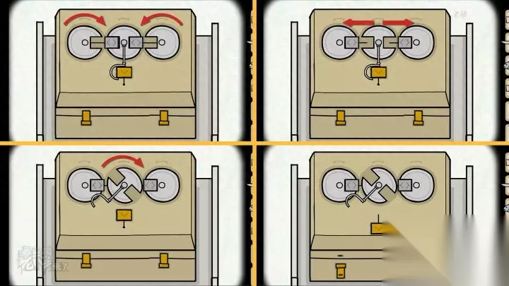 人形-斗柜视角:先旋转【圆形旋钮】,再将两个按钮横向拨动,然后旋转中间的圆形带钩的转盘,最后向下拨动黄色按钮,【盒子】被打开