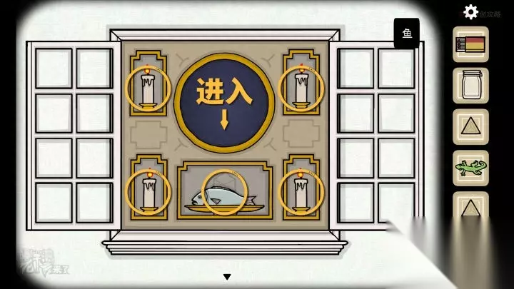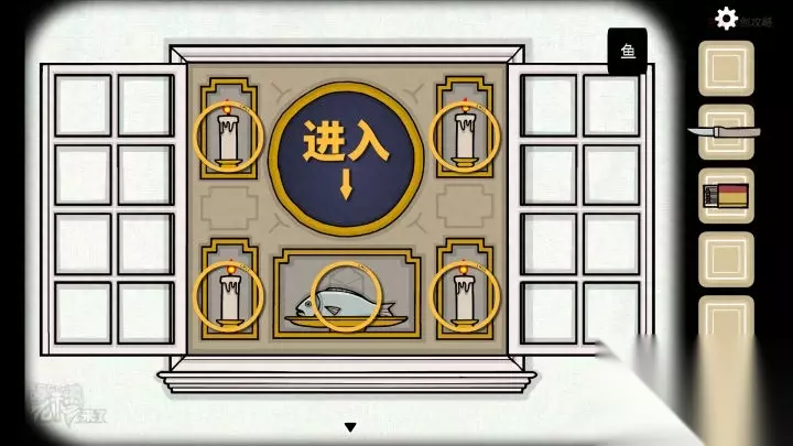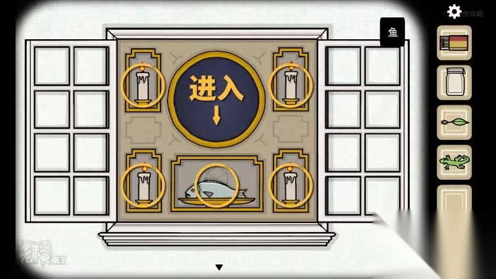人形-虫洞视角:将【鱼】放置在【虫洞】中心的盘子上,并用【火柴】点燃四根【蜡烛】