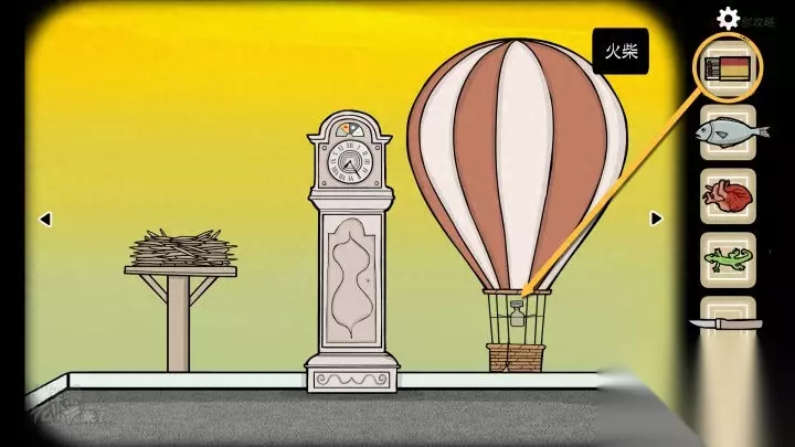 鸟形-落地钟视角-晚上:打开【热气球】加热装置的【圆形开关】,用【火柴】点燃【加热装置】