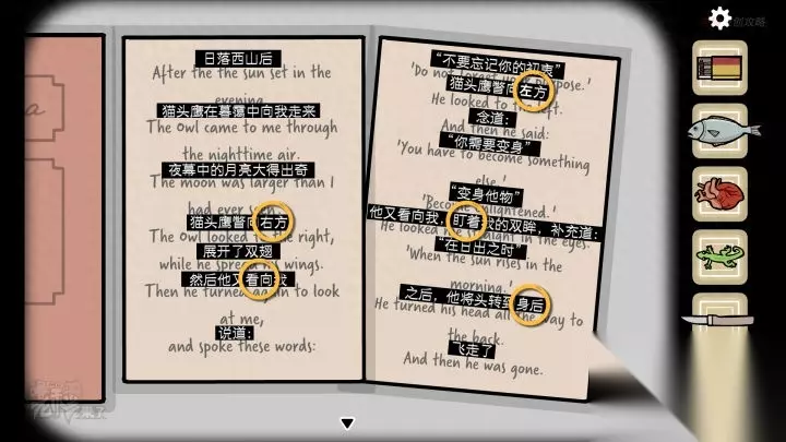 鸟形-斗柜视角-深夜:点击眼部三次,让【眼睛】全部睁开,并向四个方向拖拽,可以看到不同的【符号】