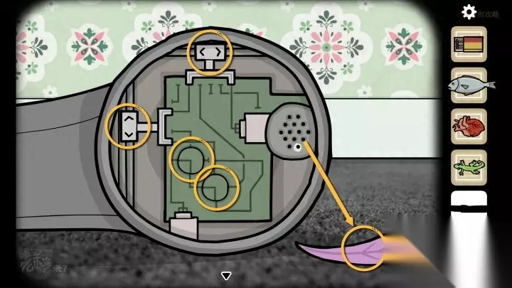 虫子-镜子视角:如图所示,拨动按钮,旋转圆形转盘,电路通联后,可以通过点击【发声孔】产生声波击落一片【花瓣】,并拾取