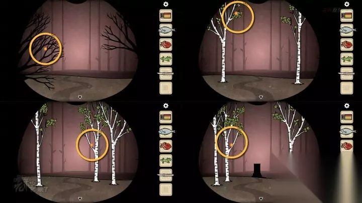 鸟形-斗柜视角-下午:分别敲开弹壳,然后从第一组小鸟(和其它两只小鸟不同的小鸟),开始分别点击之前从未出现的事物,即可解开谜题,拾取【羽毛】