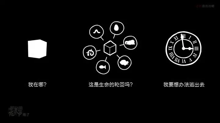 首先出现的黑色背景白色图案,其实是本部游戏的解谜关键点: 记忆方块,轮回的要素(虫子、壁虎、鱼、心脏、蛋、婴儿)和钟表 那么先来简单普及一下锈湖方块的定义,有助于理解游戏: 白色记忆方块:正常的回忆 黑色记忆方块:痛苦的回忆 蓝色记忆方块:具备回到过去的能力 合成白色+黑色+蓝色记忆方块=金色记忆方块:有抵达未来的能力