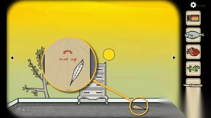 鸟形-斗柜视角-晚上:【纸飞机】打开后可以拾取【羽毛】一支,纸上画着【电话图标】以及【rise up】