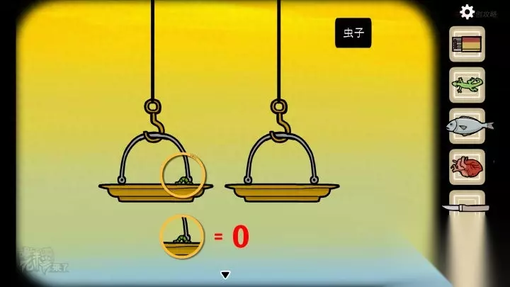 鸟形-镜子视角-晚上:将【虫子】放在左侧,右侧天秤空置,天秤平,得到【虫子的重量】=0