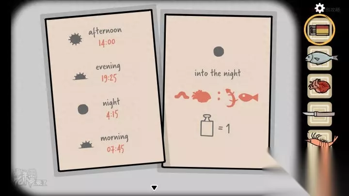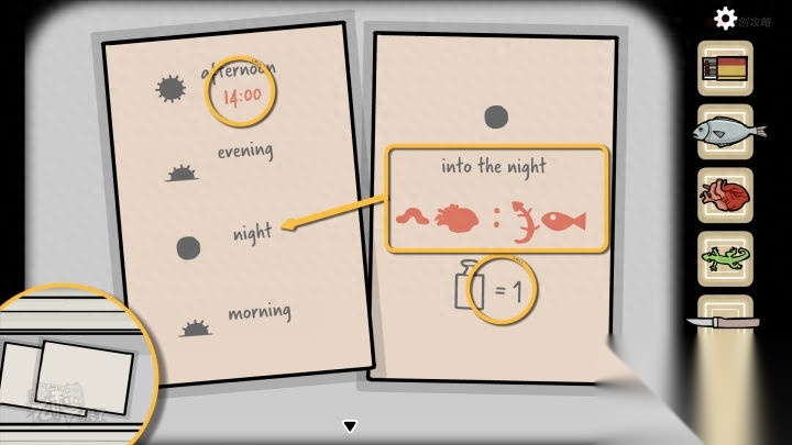 鸟形-斗柜视角-下午:两张纸张上显示了解谜的重要线索,左边是【下午时间:14:00 | 晚上时间:?| 深夜时间:?| 早上时间:?】,右边显示的是【深夜时间】的线索,深夜时间是-【虫子重量】【心脏重量】:【壁虎重量】【鱼的重量】,并注明【砝码】的重量代表【1】