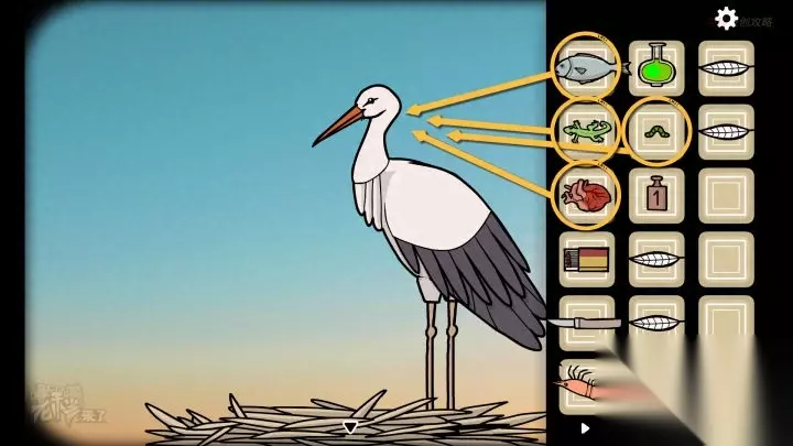 鸟形-落地钟视角-早晨:将【鱼】、【壁虎】、【心脏】和【虫子】喂给【白鹳】