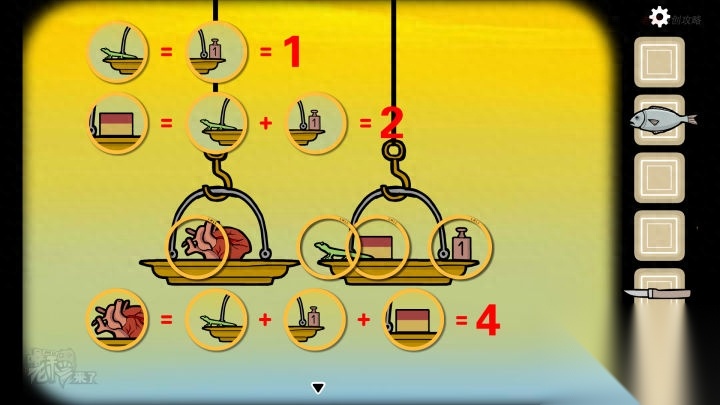 鸟形-镜子视角-晚上:将【鱼】放在左侧,【心脏】和【砝码】放在右侧,得到【鱼的重量】=5