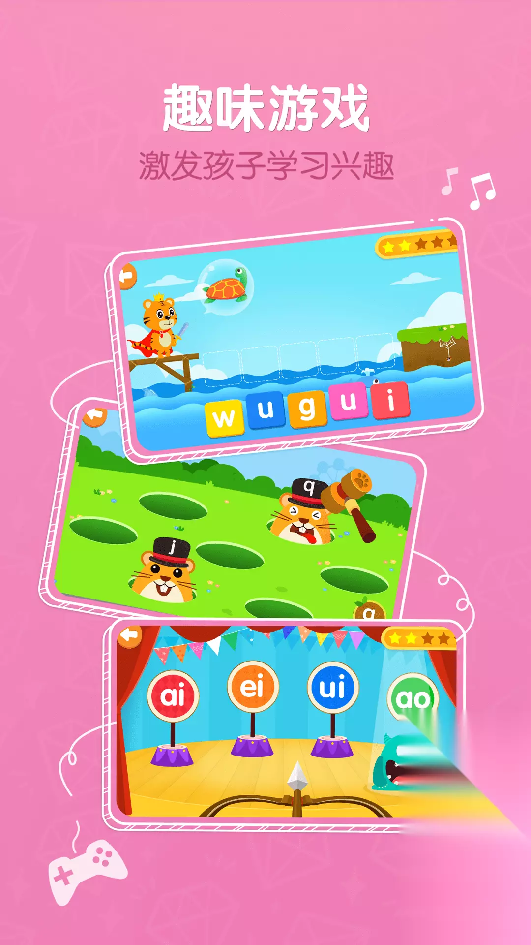 这个游戏不止是简单的叫小朋友拼音,它根据学校的教材进行设计课程,它把拼读组合起来,你在玩的时候训练你可以从认、到写、到读等等,甚至为了加深孩子们的记忆,还编入了儿歌,让小孩子更好的记住拼音的规律,它里面也有很多和拼音的互动游戏从而保证了游戏的趣味性,在游戏里面它还加入了可爱的恐龙动物,小朋友们可以在好玩的小游戏当中,一边收集小恐龙,就想一款寻宝游戏一样。 高速下载 普通下载 优先233乐园APP下载 2、《儿童拼音王国》