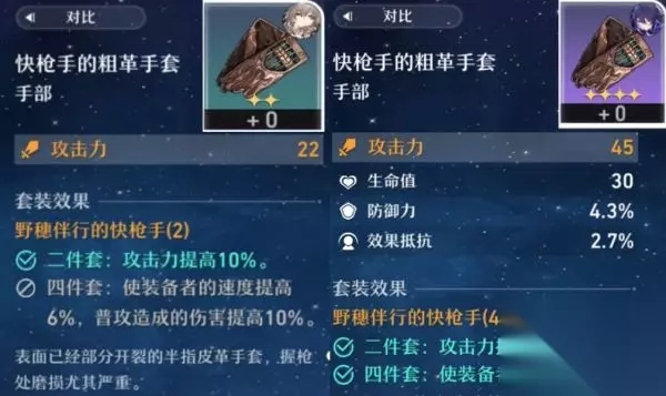 我们先看遗器,两个遗器套装效果,对角色输出提升如下: 我们可以看到快抢手输出提升,明显高于怪盗,所以我们肯定要选快枪手遗器有帽子和手套两个部位,帽子加生命值,手套加攻击力,我给大家看一下4星手套较2星手套的伤害提升