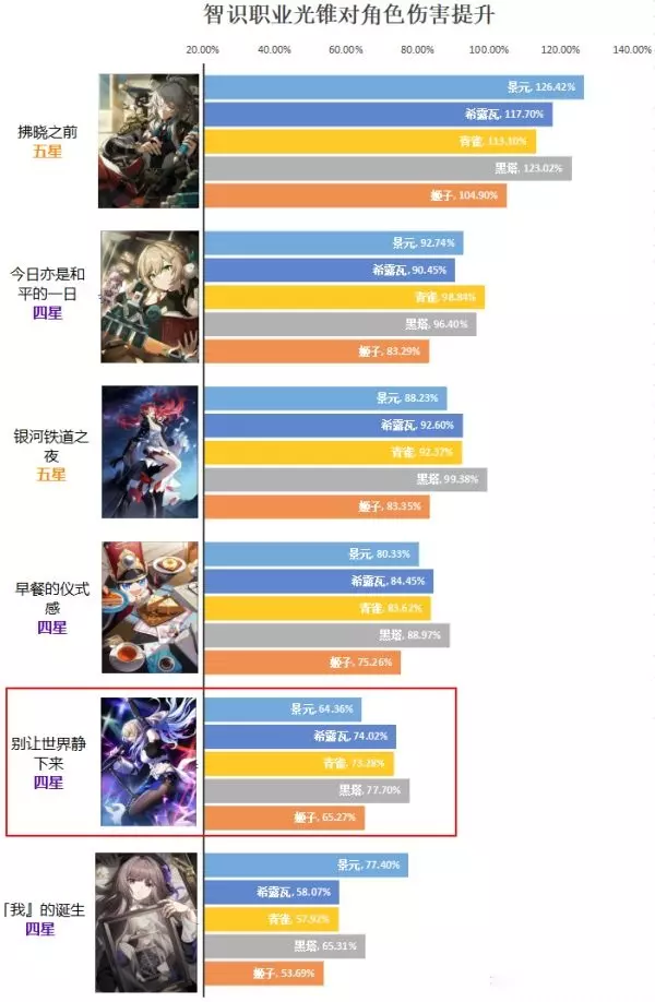 四星光锥【别让世界静下来】是智识职业光锥,也就是说所有智识角色都可以带,那么我把所有智识光锥搭配智识角色,分别计算出对每个角色的伤害提升百分比,这样我们就知道光锥的综合实用价值 (四星光锥按5阶强度计算,5星光锥按1阶强度计算)