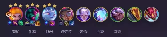 阵容攻略:查看详情 3、超频安妮 阵容构成:安妮、妮蔻、悠米、莎弥拉、盖伦、扎克、艾克、纳亚菲利、奈德丽