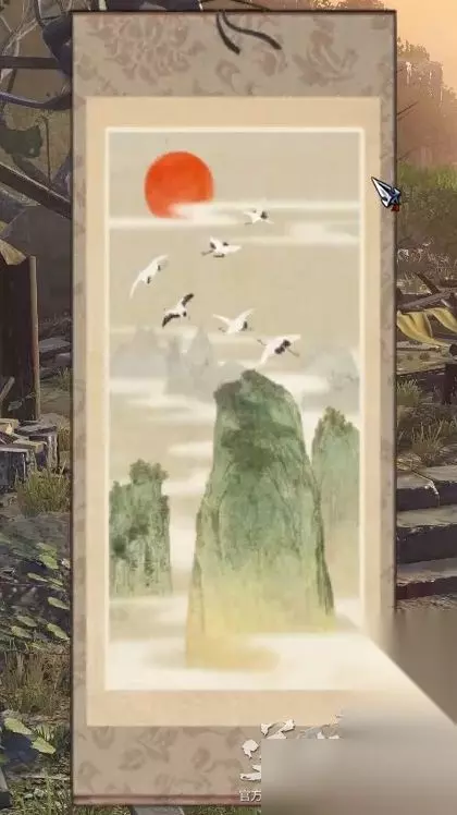 如图所示,这画卷上有一个太阳、六只仙鹤、三座山。从而得知密码箱的密码是163。 再去把密码箱打开,就会得到第一个任务用品:三角铜铸件