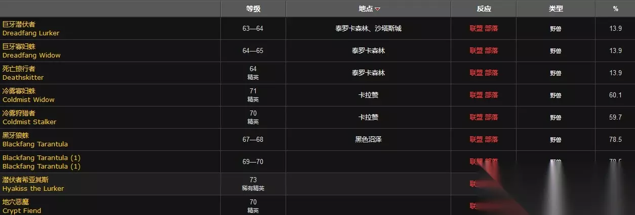 在魔兽世界这款游戏中,刷灵网蜘蛛丝的地点是在泰罗卡森林。玩家可以在泰罗卡森林的血环废墟下方和奥蕾莉亚要塞左侧看到名为巨牙寡妇蛛的普通怪物,玩家击杀巨牙寡妇蛛会有13.9%的概率掉落灵网蜘蛛丝。