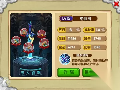 5、【绝仙剑】:推出第二把传说法宝,绝仙剑!其发动的绝杀剑阵同时滑动屏幕可使四方俱灭!绝仙剑可镶嵌法宝进行属性提升!