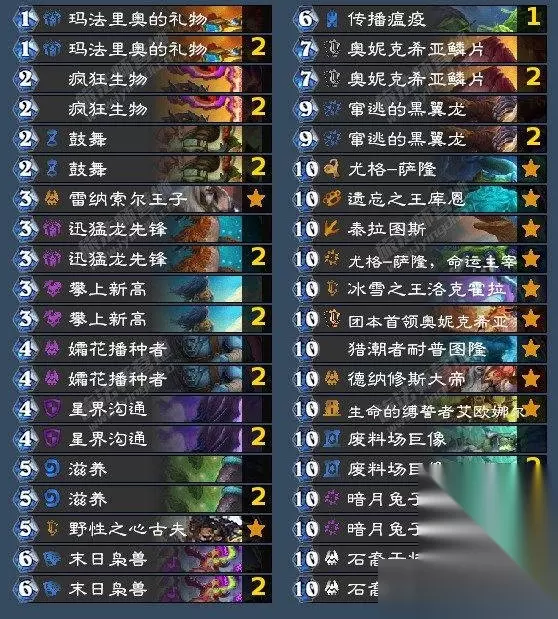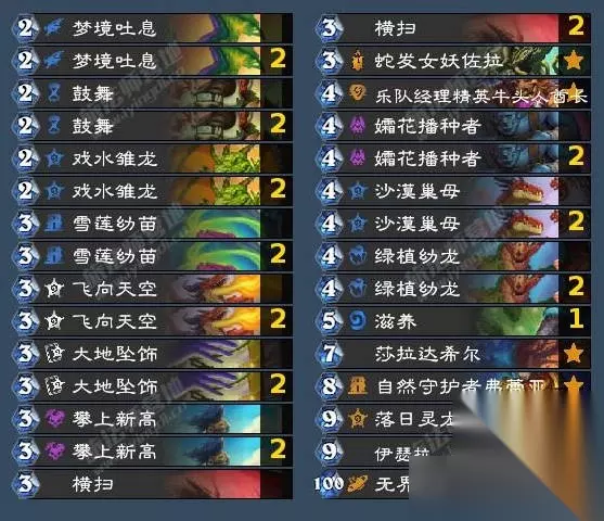 起手找洞察造物协议和亡者复生,然后大量复制212和342创建黑暗之赐随从,最后利用aoe清场一直使用黑暗之赐随从就好了。 翡翠梦之队 使用80张法力值消耗为10点的随从牌。 累积型成就,很恶心人。这个成就要求使用10费随从,但费用是不能变的,所以巨人和闪金镇豺狼人都没用,只能硬下10费随从了。 因此做这个成就就用星界德做了,尽快跳费到10费然后一直使用10费随从就好了。但实战发现德鲁伊跳费太快了,星界沟通效果很一般。 推荐卡组代码: AAEBAc6LBQzprALguwLixwKgzQKd2AOJiwTvpASlrQS/zgTp0ASX7wSf8wUOX+EV87sDveEDlOQDz6wEwd8ErO0EzoAGiaEG76kG88oGtfoG9qcHAAA=