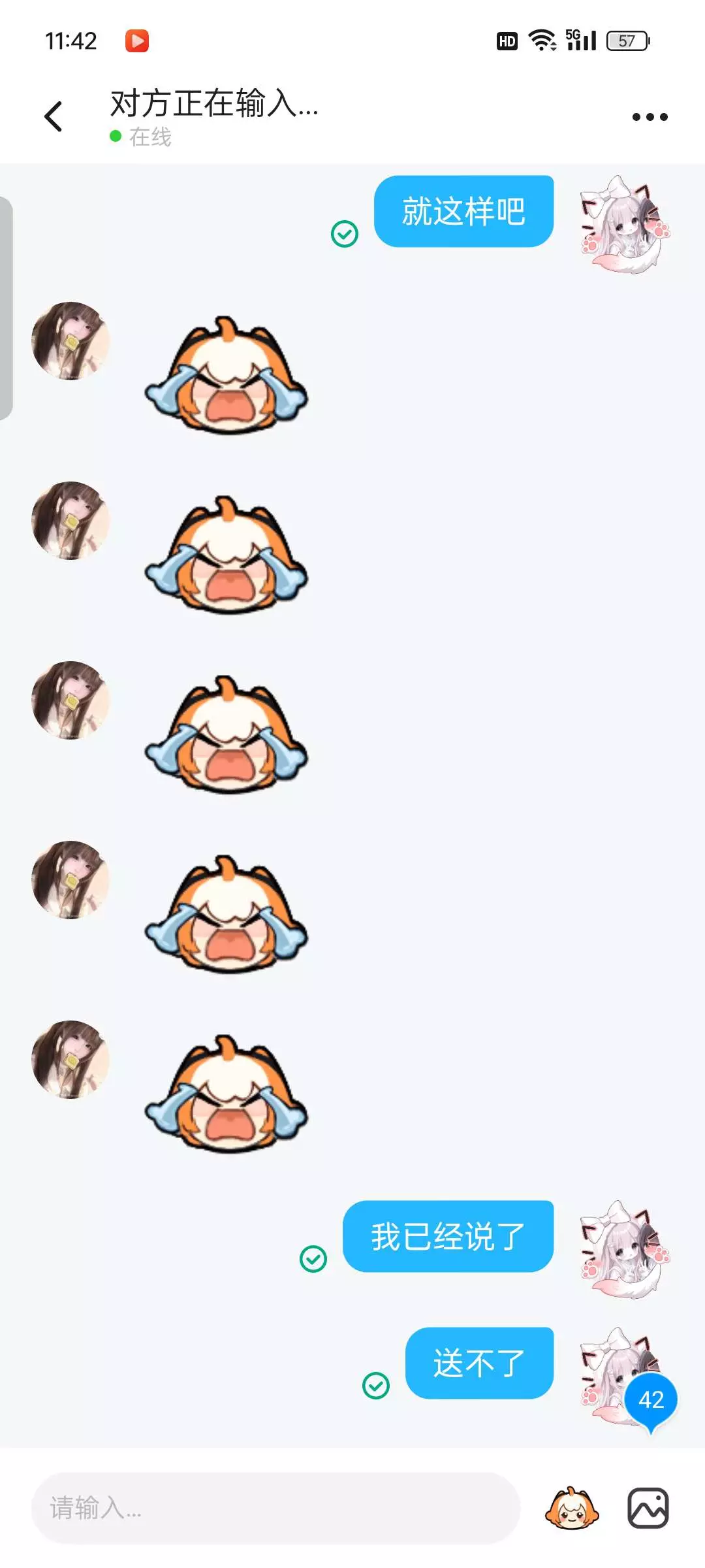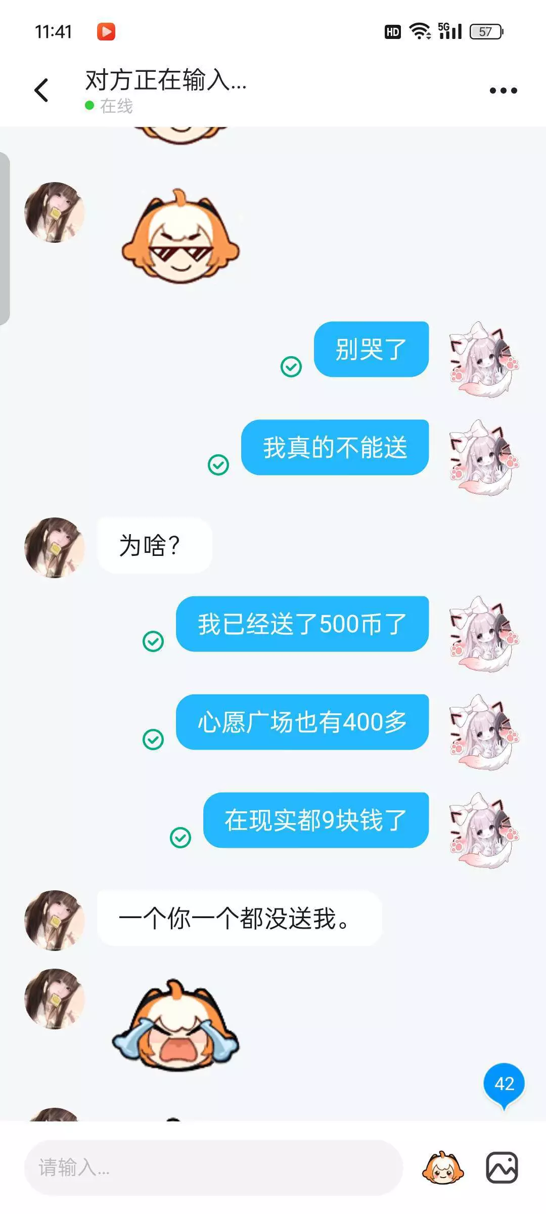呃呃无语本来她说星期四会送我.结果今天她过来问我有没有马内,让我送她我说不送他就一直发哭哭说就送这个