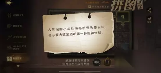 哈利波特魔法觉醒古灵阁的小车拼图线索在哪 1、今天我们进入游戏之后,需要先到拼图寻宝活动界面领取一下线索,今天的线索是:古灵阁的小车让海格感到头晕目眩,他必须去破斧酒吧喝一杯提升饮料; 2、我们根据这个线索的提示,然后打开地图,传送到摩金夫人的长袍店,来到摩金夫人的长袍专卖店的内部柜台上面; 3、到达之后我们就可以在柜台上找到中间的金加隆长袍,然后走进点击互动,就可以获得今天的块拼图了。