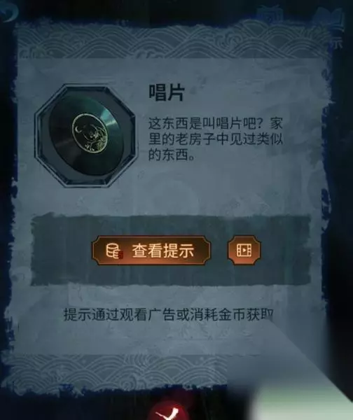 8、返回教室位置,点击左侧黑暗房间,去除房间,在房间中间查看,然后点击左侧靠着的铁棍,获得唱片,将“奘铃”装上。