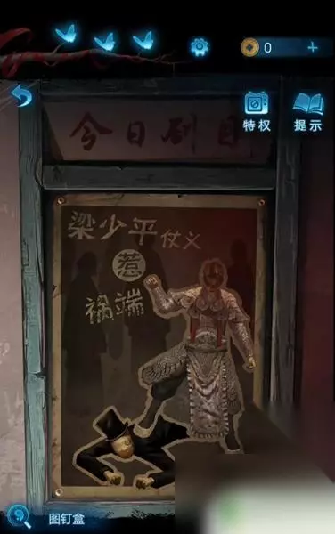 7、接下来直接将纸钱放到火堆树上开花,观察花瓣的颜色来调整海报上的面具,随后使用铁钩固定住位置,得到牌位,并将牌位放入神龛,获得望远镜。 8、望远镜道具使用处在观察戏台上,这时利用葫芦放到中间小人位置。掉落木剑道具,随后将木剑在放到男童手中,可以蝴蝶板凳,在将板凳放到戏台右边小人上,然后在使用望远镜查看戏台处,这时可以获得酒壶。