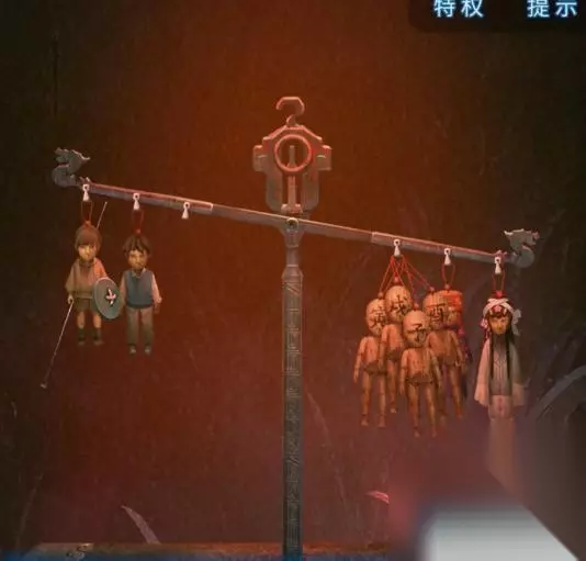 17、离开房间,再次进入到树洞房间,选择桌子放入两个木块,然后回到幻境,将新的木偶放到称竿上,边上的画打开,同时称上再试失衡。
