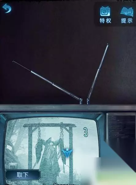 5、然后找到教室里的电视机,将“铁条”放入到天线上,根据日记的线索来调整电视机,步骤如下图。