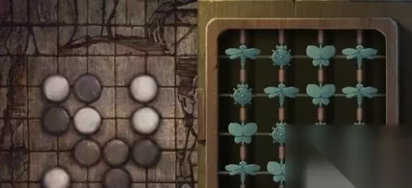 14、进入到全新的房间,点击红色的蝴蝶,按照棋盘颜色来将蝴蝶(蜻蜓白色,瓢虫黑色,蝴蝶没有颜色)位置调整。