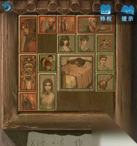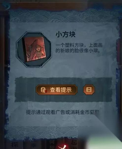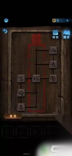 4、把红绣鞋放到火盆中就能打开墓碑后的暗门。 5、走进入用纸伞开门,退出暗门屏幕上会出现文字。 6、再点击座位上的木盒,将文字摆成“奠丧婚吉嫁”后就能开启并获得化妆笔。