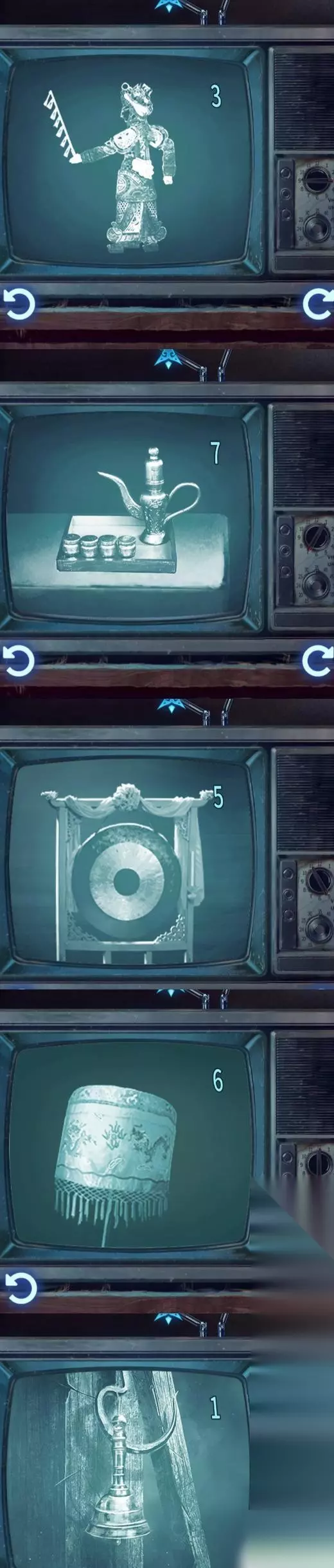 9、根据之前电视机中获得图片的图片和数字以及天上北斗七星来进行点击:①-奘铃;③-皮影;⑤-锣;⑥-伞;⑦-酒壶