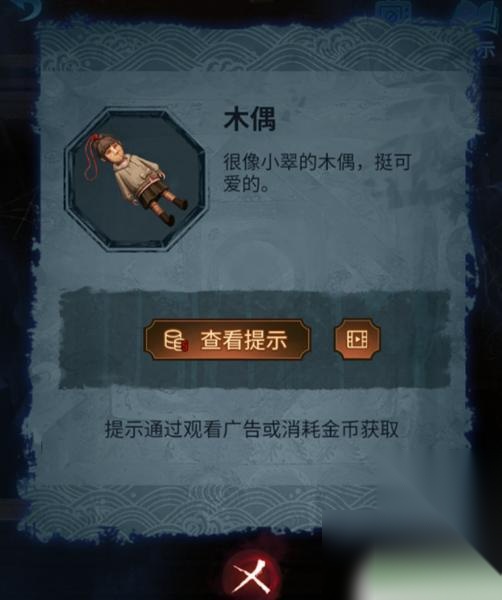 11、用剪刀剪开柜子上的红绳得到卡片,使用铁钩框柱窗台后得到第二个卡片。进入心理测试阶段,等待第二天返回使用望远镜查看窗户外面,完成测试后一皮影树木二木偶照镜子三两个木偶四木偶五脸谱六神龛七剪纸八石人九蝴蝶十布偶得到锤子敲,剩下的就是过剧情了。