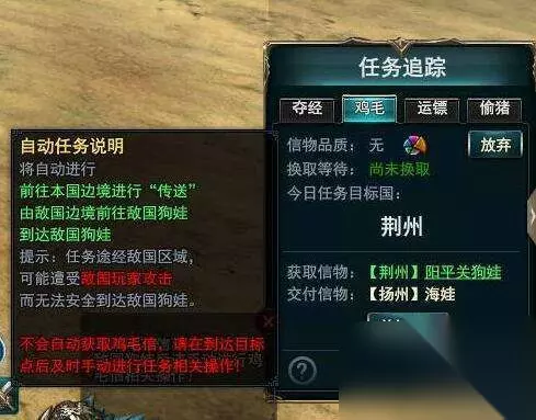 【副本玩法说明】 从本国边境“海娃”出领取鸡毛信,送往目标国家王城郊外的狗娃,对话提交鸡毛信后回报给海娃,可以获得海量经验奖励; 放弃任务会消耗当日任务次数 【任务技巧】 在海娃处接任务后,右下角会弹出“任务最终”界面,玩家可点击敌国狗娃的连接,自动跑地图过去(但不能自动过边境哦,需玩家手动过边境,避免被敌人围殴) 玩家也可以勾选“自动鸡毛信”,这允许玩家自动跑到敌国狗娃处,但不能获取鸡毛信,还是需要玩家手动进行任务相关操作 更换信物颜色需要15s的时间,建议玩家刷出蓝色及以上就可以了,如果周围没敌人,可以考虑刷紫色及以上 获得鸡毛信后点击右下角任务追踪里面的“回本国王城”可直接回城