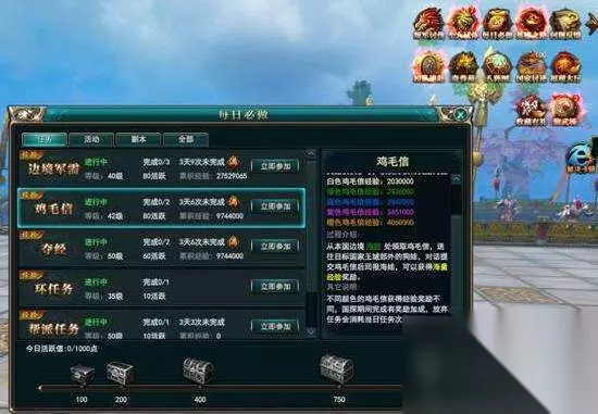 【玩法入口】 点击右上方的“每日必做”按钮,打开菜单 选取任务里面的“鸡毛信”并点击右侧的“立即参加“即可