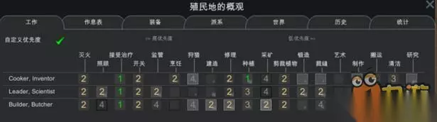 最后进入概况根据小人专长调整工作优先级,接受治疗最优先,其后灭火: