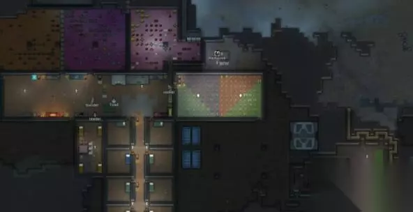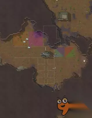 并在这时候开始建造交易系统,把信标放在物质区。 用棉花做衣服替换掉小人身上的旧衣服。 当你相对稳定之后,就开始建设真正的防御阵地! 防御阵地在最开始规划时就应该考略在内,而这也是本游戏最好玩的阶段了。 如何防御每位玩家都有自己的一套方法,或塔防或迷宫 但是无论什么方法最优先考虑到的就是如何将敌人引入你的埋伏: 第一,敌人优先攻击近处的小人; 第二,物品仇恨、炮塔>门>其他家具物品>墙。 本人常用近战拐角防御的方式:
