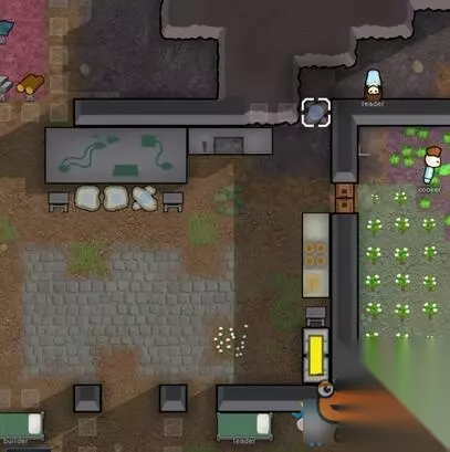 当袭击来临,小人如此站位,第一个位置空着,待敌人全部进入后截其后路,主要武器就放在附近储存,战时方便更换。 期间多移动小人到不同位置攻击,以后人多时可以控制小人(快捷键B)攻击同一个沙袋使其集中在一点后再次征招(2次R键)使输出最大化。 而炮台区完全可以扩建成正式的防御阵地或者雷区。 中期及后期玩法: 中期: 当我们的防御阵地成型,敌人类型开始出现机器人时差不多基地已经初具规模。 封闭的环境很容易让小人患上幽居病,这时可以如下制作一间露天餐厅(雾):