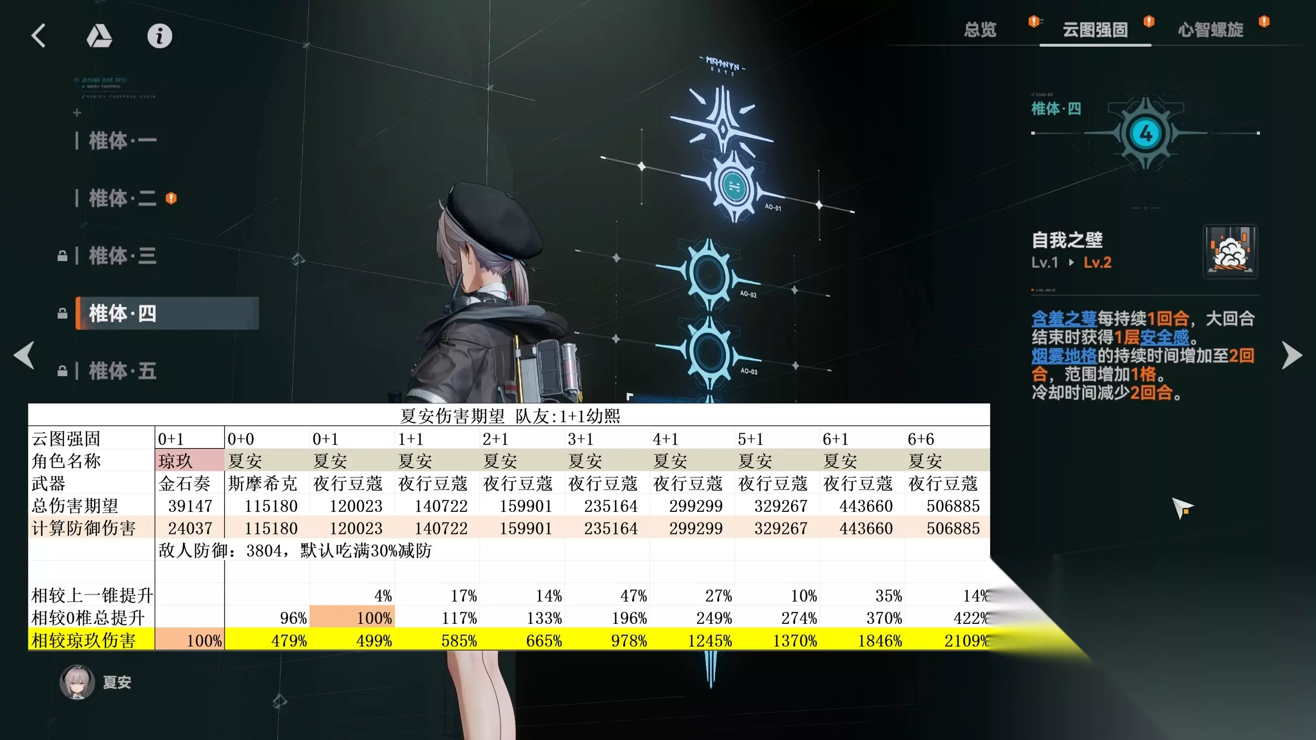4 椎效果:描述看似复杂,核心有用的仅 “安全感” 效果 ——2 技能状态下每回合提升 20% 攻击力,最高可叠加至 60%,7 回合平均下来能提供 42.9% 的攻击加成,总伤害提升约 27%,属于中规中矩的收益。但是要知道,局内攻击力和局外攻击力是直接进行乘算的,所以夏安专武提供的攻击力词条,在4椎下的收益会比爆伤武器更高。