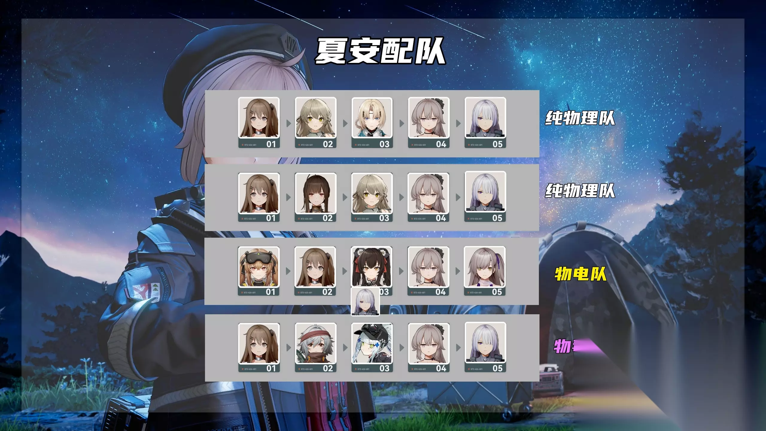 纯物理队有两种方式:从左到右为角色行动顺序:幼熙→莱妮→乌尔丽德→夏安→威玛西娜或者将乌尔丽德换成罗蕾莱,变成:幼熙→罗蕾莱→莱妮→夏安→威玛西娜的行动顺序如果是混色队,仅推荐物毒和物电两种物电队为:莱娜→幼熙→绛雨/威玛西娜→夏安→莱娅物毒队为:幼熙→米什缇→可露凯→夏安→威玛西娜这两个队伍的底层逻辑是,物电队莱娅可以吃到幼熙的【稳态攻势II】获得额外倍率,物毒队则是毒队的减防不限属性,且幼熙的加攻效果对于毒队提升巨大。其他队伍就没有这样的联动效果了,所以也不做推荐。