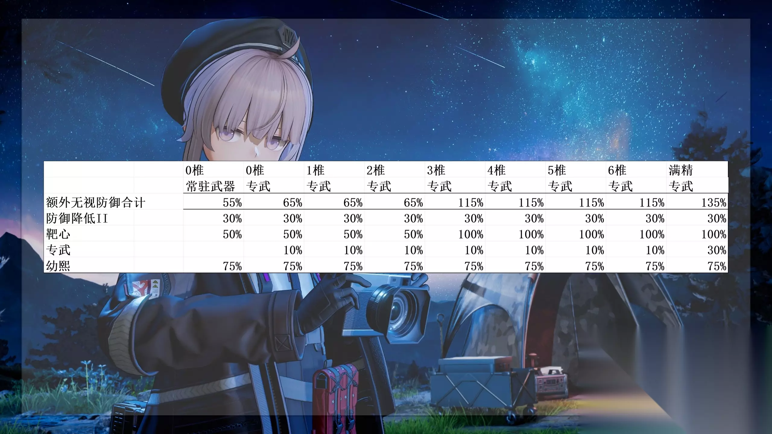1 椎效果:纯粹的爆伤加成,对单场景下可提供约 29.6% 的爆伤,总伤害提升约 17%。需要注意的是,“无视稳态” 效果并不会加快夏安的破稳效率,仅能直接无视目标稳态,核心作用就只有更轻松地秒杀高台掩体后的杂兵。