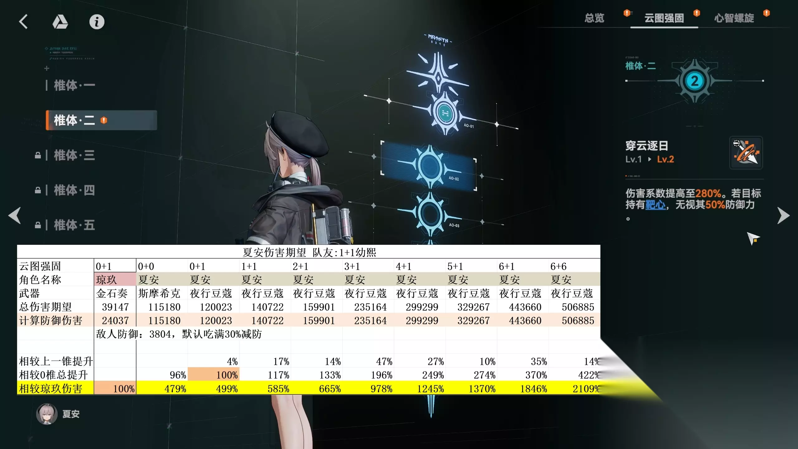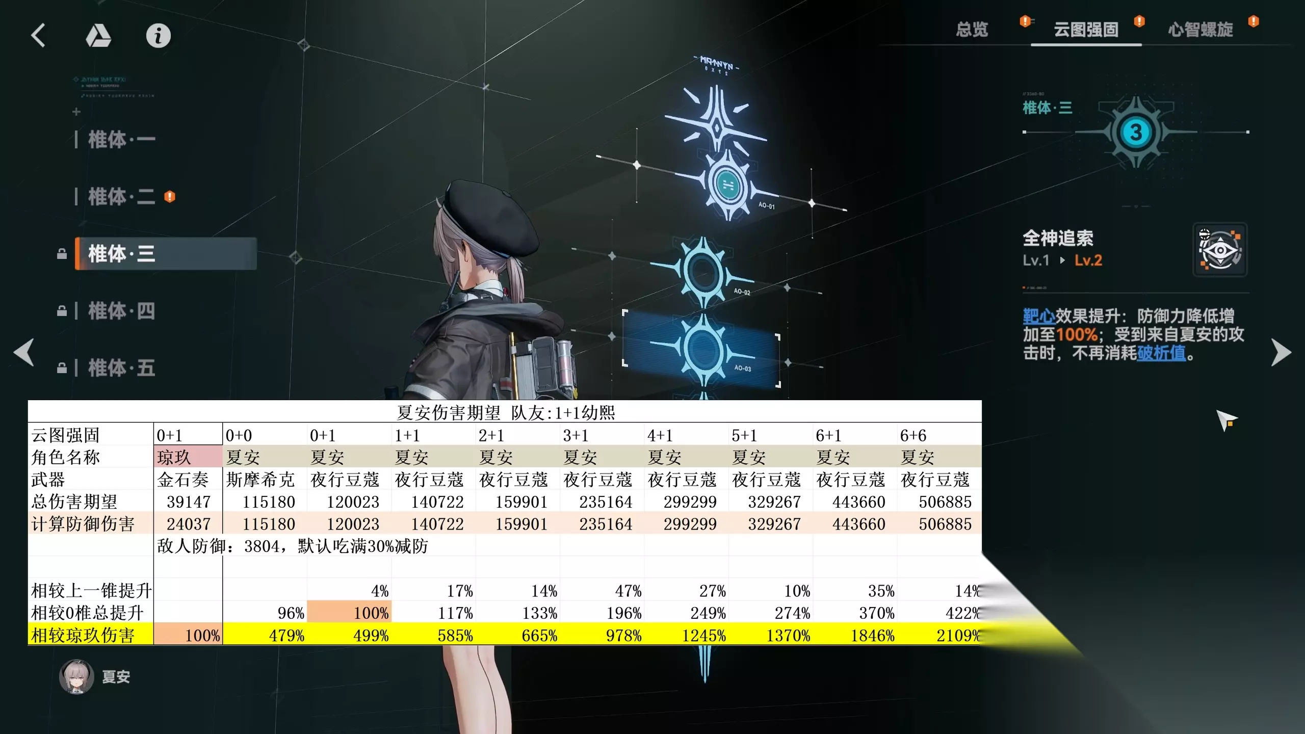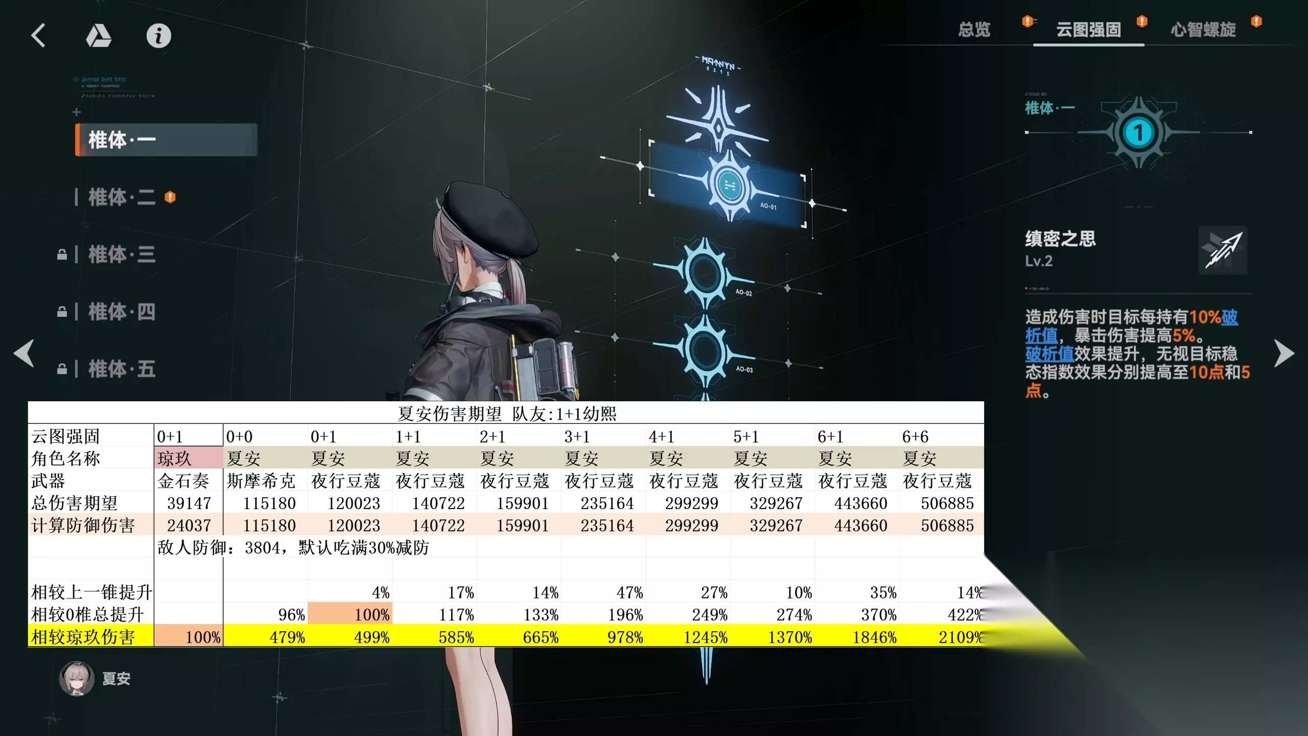夏安作为物理角色,极度依赖【反御增伤】buff。但是夏安和威玛西娜最大的不同就是,威马西纳可以为自己提供【反御增伤】,而夏安不行。这也就意味着夏安高度绑定幼熙作为队友。不过即便在大量损失自己额外无视防御的情况下,满椎夏安的单人伤害依旧能做到和满椎威玛西娜55开,同为10玖。而0椎方面夏安的伤害期望就碾压威玛西娜了,达到了3.39玖,几乎是威玛西娜的2倍。一般来说,0椎3玖的数值是在携带辅助角色的情况下才能做到