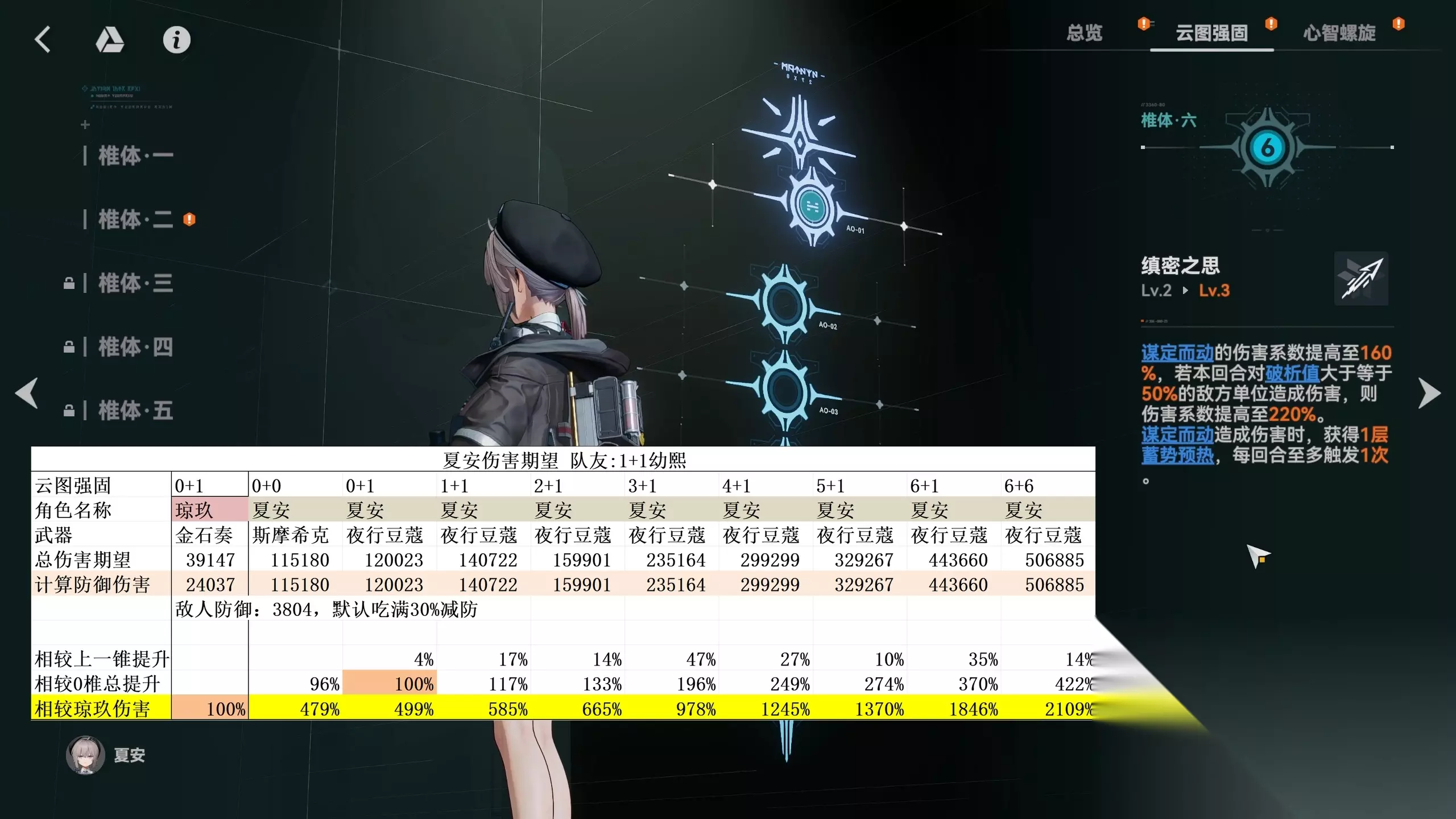 6 椎效果:核心是强化被动监视攻击,倍率从 180% 提升至 220%,对单场景下相当于每回合多增加 80% 倍率;同时每次监视攻击会叠加一层 “蓄势预热”,最多可提升制胜技 240% 倍率(需叠加 3 回合)。也正因为这个叠加机制,6 椎夏安需要将第一次制胜技释放推迟到第 4 回合,不过这并不影响总释放次数,7 回合内仍能释放 3 次,此时制胜技的实际倍率相当于 620%,对喜欢 “大数字” 的玩家来说堪称福音,总伤害提升高达 35%。