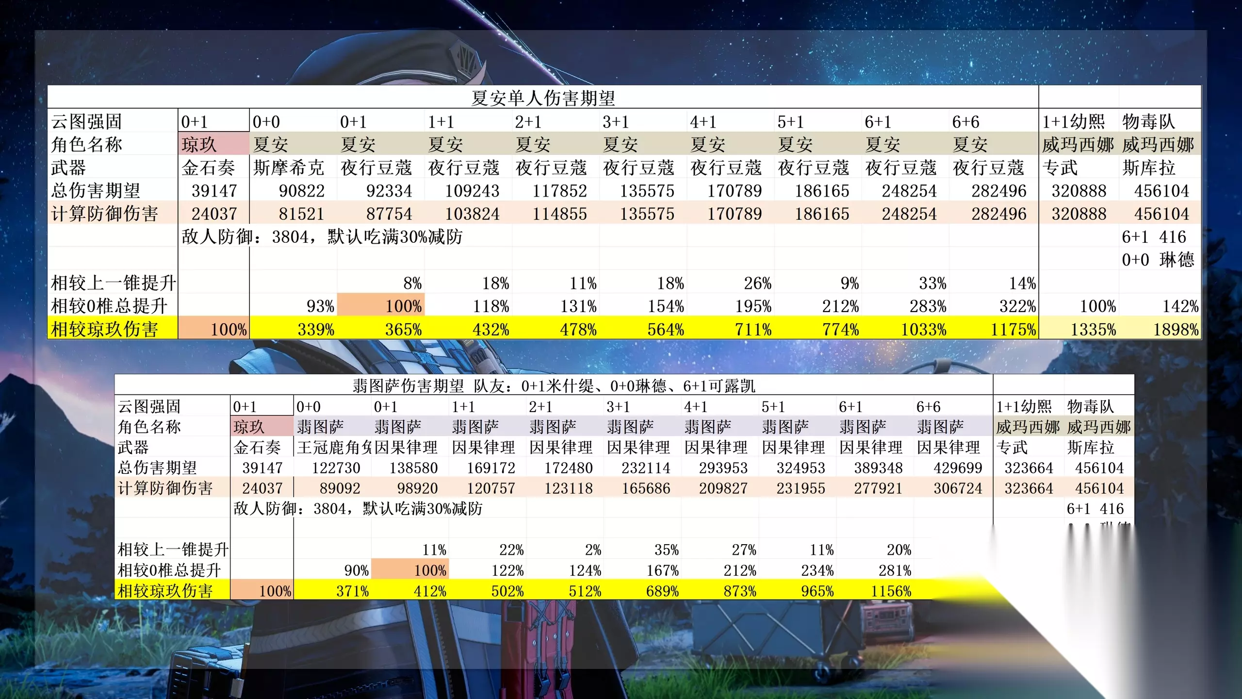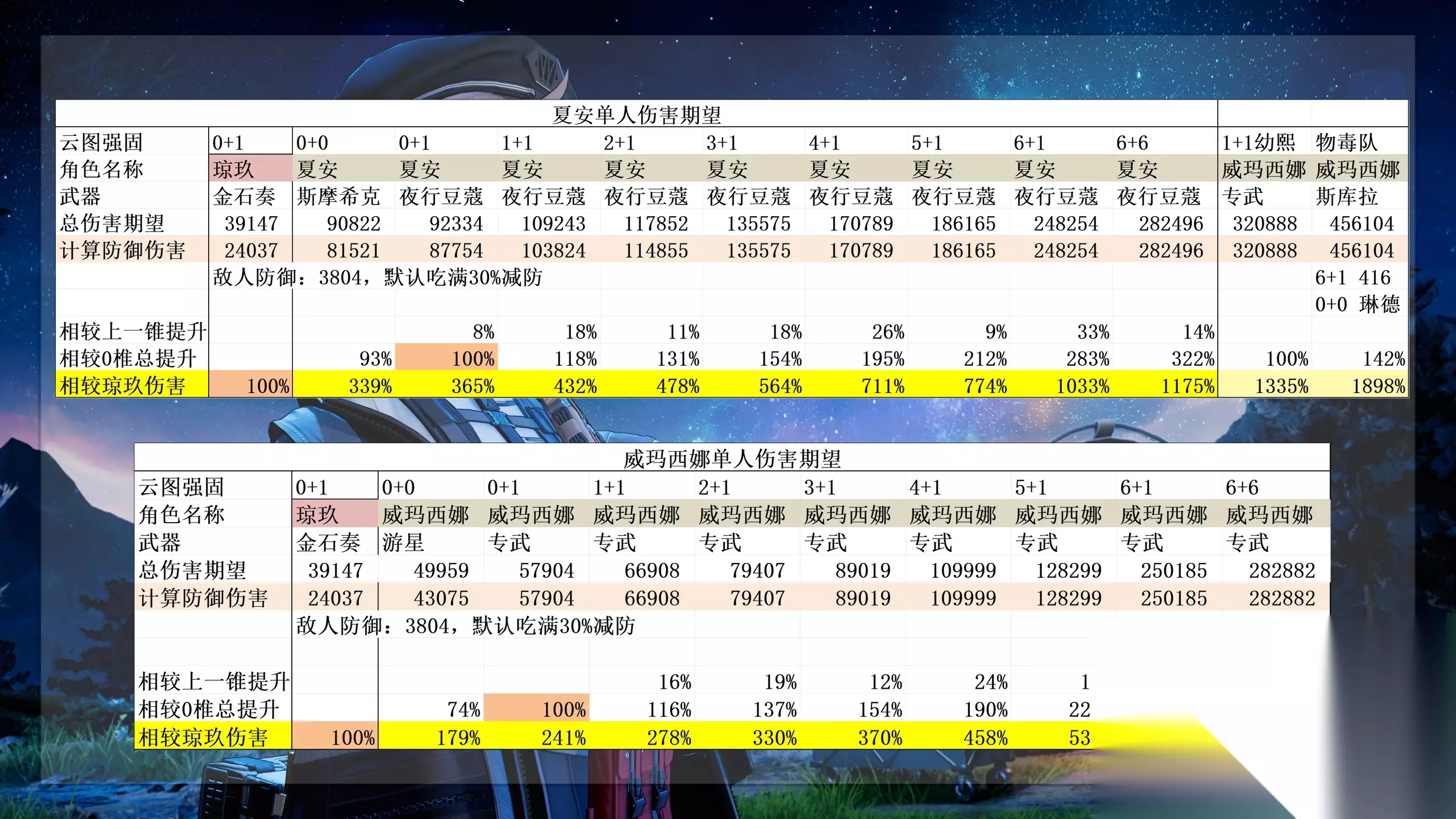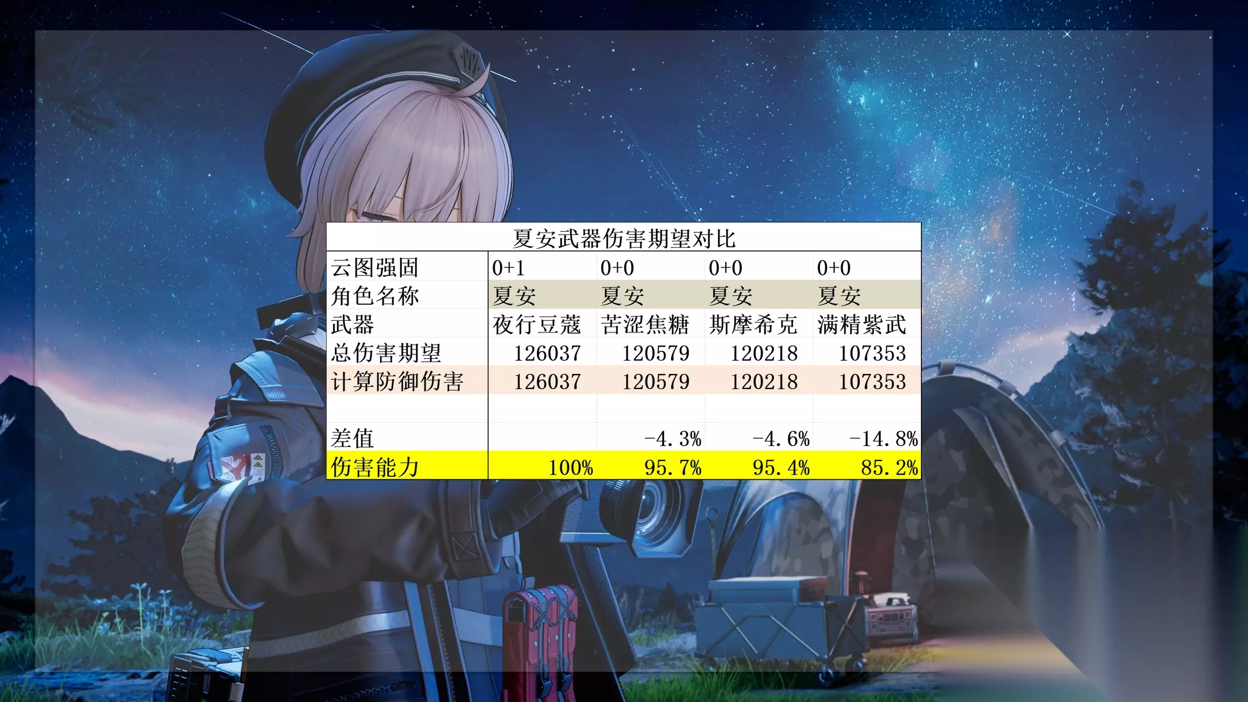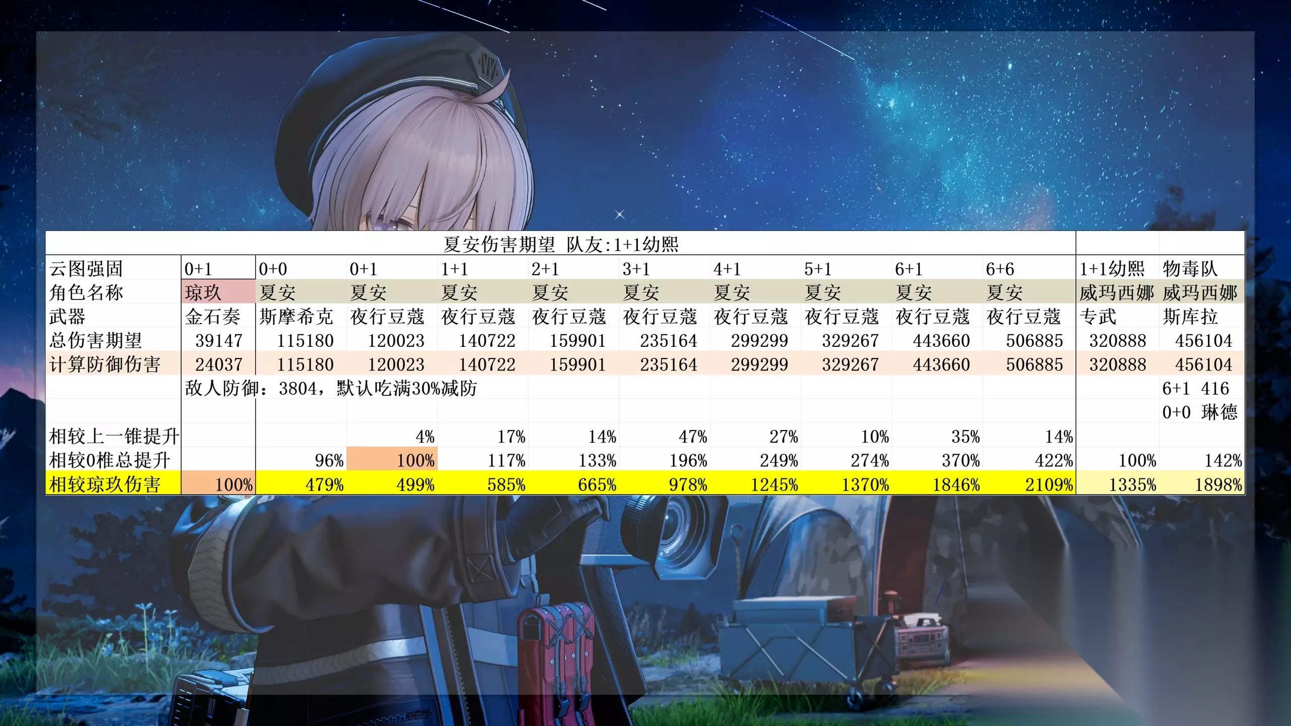 角色总评先说结论在携带辅助的两人配队下夏安是目前对单输出最高的角色,没有之一6+1夏安加1+1幼熙的伤害期望达到了同样造价下6+1威玛西娜加1+1幼熙的1.4倍哪里有什么数值,我只看到了满满的努力与汗水啊即使0椎也是所有0椎角色中伤害期望最高的 抽取推荐