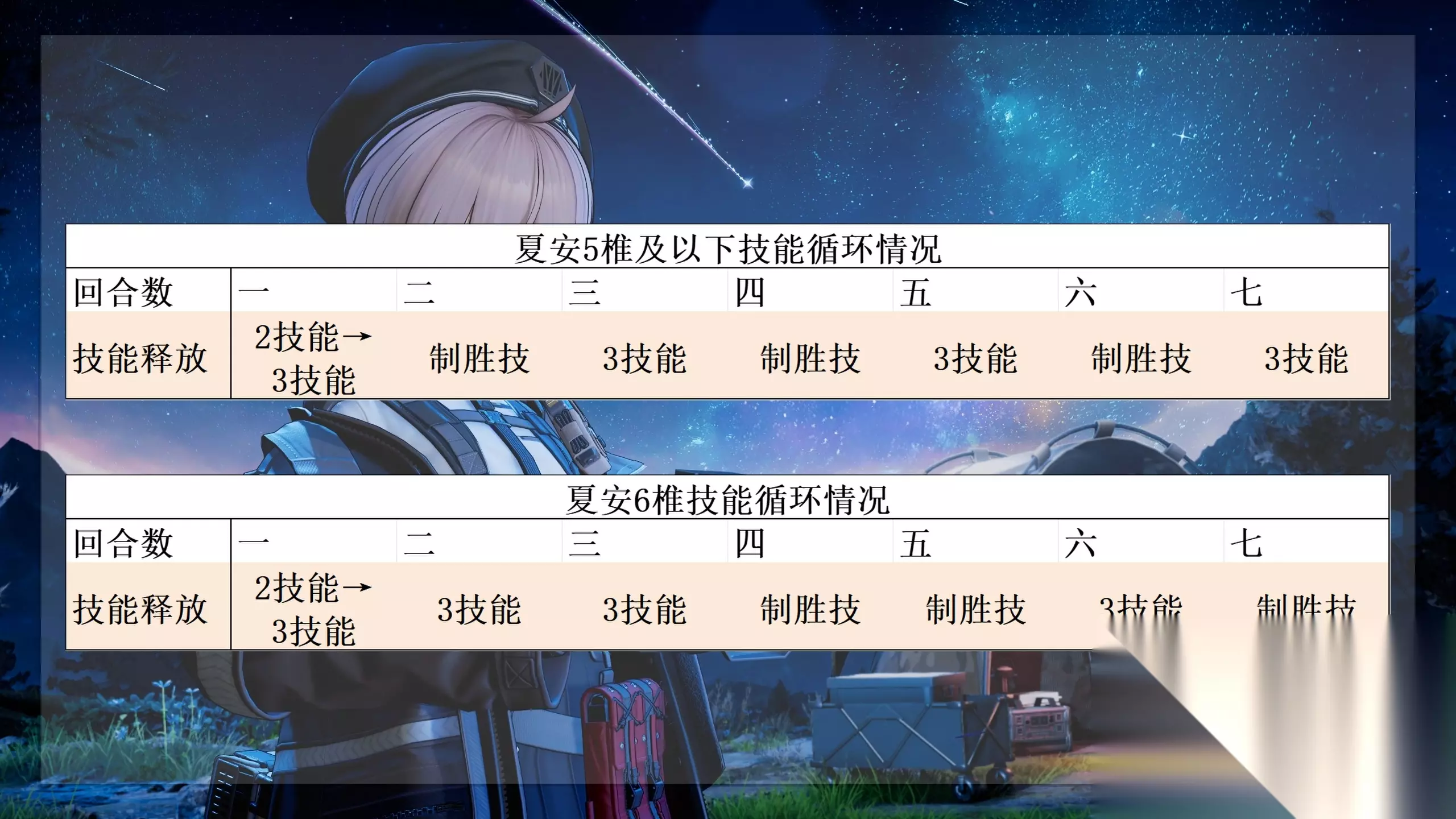 接下来就是技能循环,夏安堪称少前 2 中技能机制最直观的角色,没有复杂的联动逻辑,输出核心完全集中在被动的监视攻击与制胜技上,技能循环也简洁到几乎无需过多记忆。常规情况下,开局只需先释放一次 2 技能,后续全程沿用 “3 技能 + 制胜技” 的34循环即可;但当夏安解锁 6 椎后,循环方式会发生变化 —— 制胜技需要后置释放,不过因为无论浪不浪费导染,夏安在七回合内都仅能打出三发制胜技。