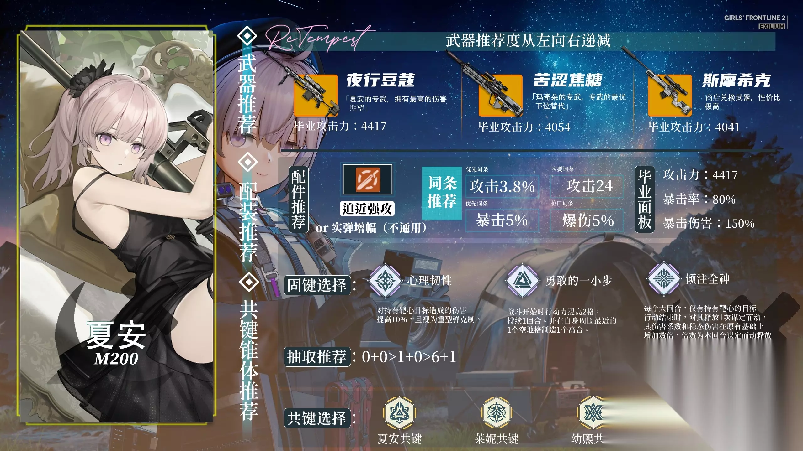 武器配件:优先推荐【迫近强攻】,核心优势是通用性强,后续也可给罗蕾莱等其余狙击角色使用;词条选择 “攻攻爆” 即,若追求极限输出,可替换为【实弹增幅】。固键推荐【倾注全神】+【心理韧性】+【勇敢的一小步】共键推荐 夏安共键 + 幼熙共键 + 莱妮共键;若缺乏上述共键,也可选用夏克里、莉塔拉、维普蕾组成的通用共键套装,伤害差距很小。