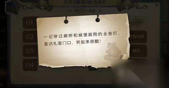 【《哈利波特魔法觉醒》巧克力蛙线索汇总】 《哈利波特魔法觉醒》巧克力蛙第四天NPC线索 线索:一记穿过廊桥和城堡庭院的全垒打,直达礼堂门口,听起来很酷!
