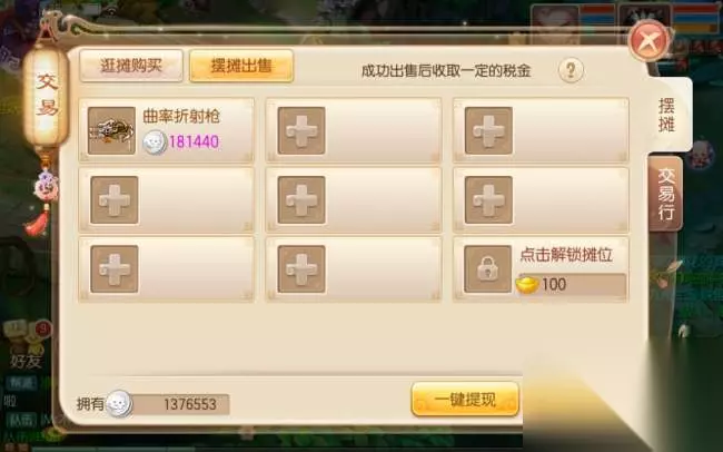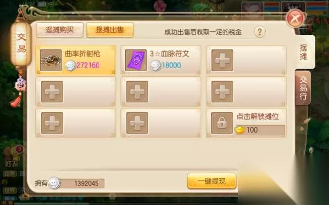 如果背包中有闲置并且可出售的物品(包括未绑定的武器、草药等等),就可以在交易中点击摆摊出售。在摆摊界面中可以看到已经上架的所有商品,上架商品选择右下角的一键上架即可。