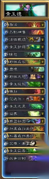 新版本上线后,极大的丰富了我们的卡组思路,玉莲帮的机制简单粗暴,德鲁伊和玉莲帮切合度很高。因此给大家带来了一套新版本靑玉德卡组,虽然青玉德打得不算多但是确实是后期极强的卡组,青玉德主要是靠青玉魔像的成长为主要目的,而前期召唤出的青玉魔像极大的增加了青玉德的战场能力,现在的环境,打脸战被青海萨打来少了很多,天梯上基本上是奇迹贼,宇宙术,宇宙法,青海萨,青玉德。这套卡组吊打宇宙系列,最怕的就是奇迹贼。