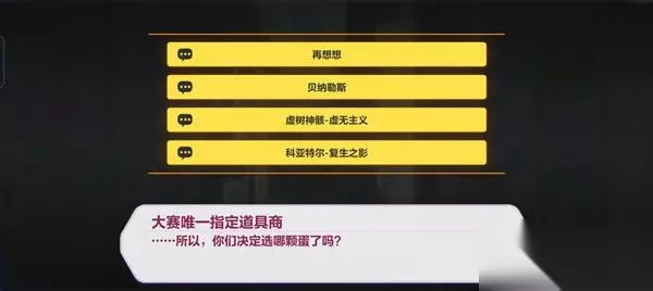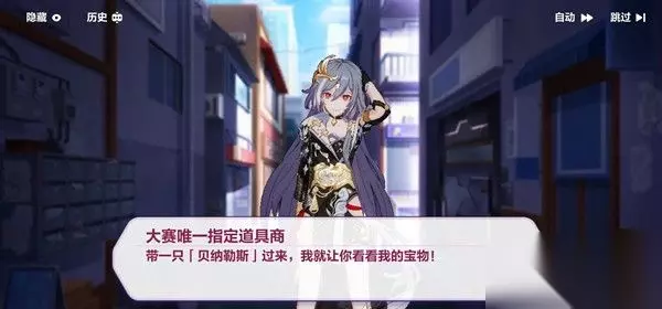 【崩坏3盛夏海滨游乐园十字路口攻略】 玩家们在1-2十字路口这一关可以触发一个特殊剧情,大赛唯一指定道具商会向玩家要求一只精灵(如贝纳勒斯),但是许多玩家都不清楚要在哪里获得。 实际上,这里给出的三个选择:贝纳勒斯、虚树神骸-虚无主义、科尔特亚-复生之影,都是暂时无法获取的。 可能需要等过段时间开放了后续的区域之后才有办法入手,从而完成这个十字路口的任务吧。