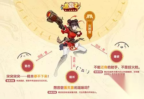 图5:火枪营三大流派 狙击流派可以造成长时间的火力压制,倾泻火力时,枪声将似马蹄般急促,踏碎敌人的防线。 猎杀流派将“唯快不破”发挥到了极致,他们拥有最广的射击领域,呼啸而出的弹丸拥有改变世界的速度。 爆破流派是火枪营的“异类”,作为射手的爆破并不惧与人近身接战,强悍的闪避能力和丰富的干扰手段足够让他们等到敌人陷入自己的节奏,在瞬间爆发出最可怖的伤害。在对抗罗刹国的入侵中,火枪营发挥了重要作用,他们用精湛的武学捍卫了中华领土的完整。