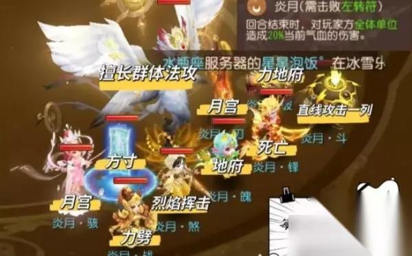 可以看到3个战场,3套阵容,需要清完全部小怪才能击杀主怪。那么问题来了,有人可能会说,一个战场清完,再转到下一个战场不就行了!这里就涉及到两个问题 1、首先女盼在转动符出现后(重置月相后3回合内可能出现转动符)会有一个增伤BUFF,你不转可能承受不住主怪的攻击,不得不转!